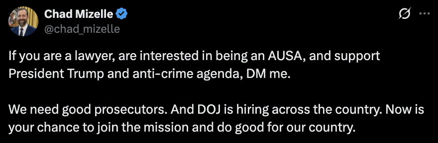 The recruitment call was published by Chad Mizelle, former DOJ Chief of Staff, whose authority to hire remains questionable after his departure last fall. His initial tweet even featured a closed direct message function, which was only corrected after public prompting — a small but telling oversight that reflects broader organizational issues.